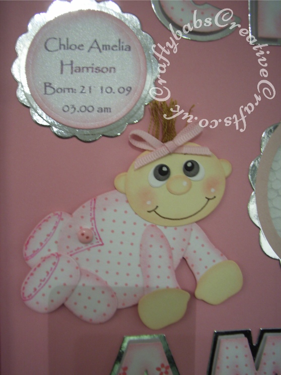 Baby Birth Keepsake photograph frame. Made using a variety of dies including Sizzix Originals Shadow box Alphabet dies, Quickutz nesting plain and scalloped circle dies ans custom made Craftycat build a bear die.