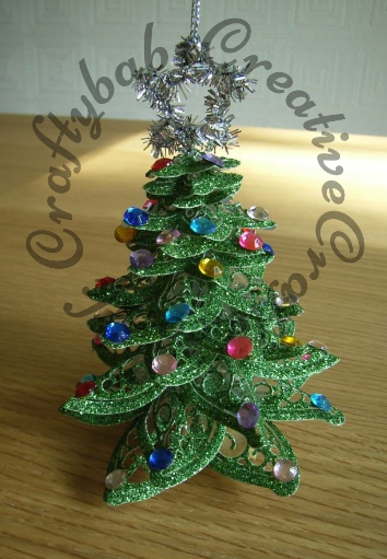 Christmas Tree Decoration made using the Tattered Lace Kaleidoscope flowers dies. All flowers cut using both part of each die from green glitter card x 3 of each size. Flowers folded mountain and valley for dimension. Acetate cones made from acetate circles between each layer to strengthen and support. Silver chenille stick formed into a star at one end, then threaded through all layers from top to bottom. gems glued in place with strong pva glue.