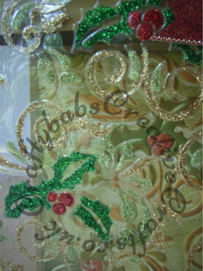 Card Made using The Tattered Lace Santa (D487) die cut from white card then heat embossed with Glitter gold embossing powder, backed with white card and coloured with promarkers. Acetate cover, background and gold trim embossed using Holly Flourish (EF008) embossing folder set,