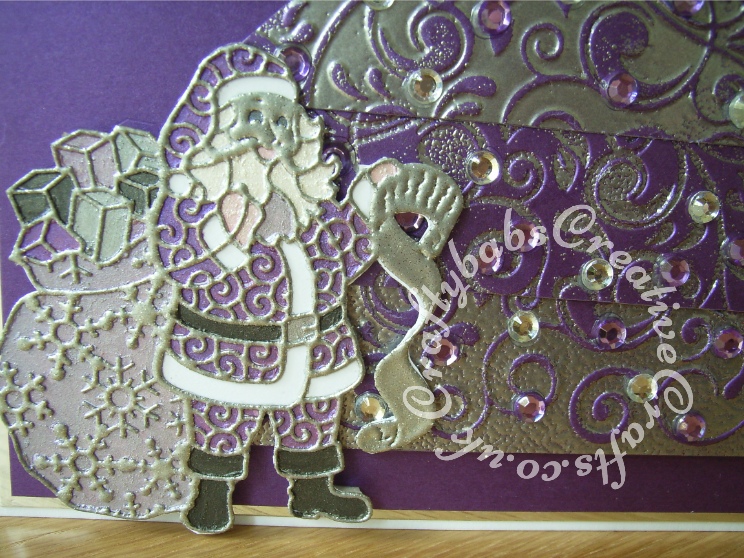 Card Made using The Tattered Lace Santa (D487) die cut from white card the heat embossed with silver embossing powder, backed with white card and then painted with pearlescent watercolour paints. Tree made using Holly Flourish (EF008) embossing folder set and heat embossed with versamark ink and silver embossing powder, then cut into tree parts and assembled. Sentiment cut using The Tattered Lace Let It Snow (D447) die
