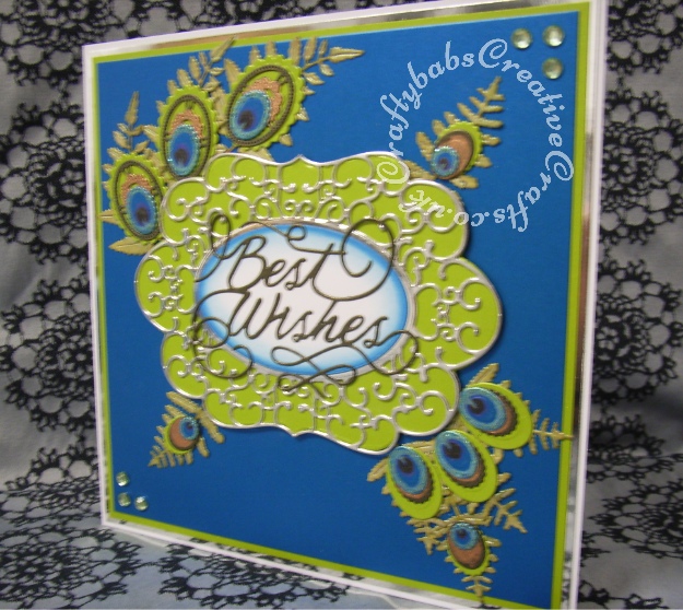 Tattered Lace Country Garden Eltham ovals and fiddle head fern dies plus Spellbinders plain and scalloped nesting ovals dies. Tattered Lace Best Wishes sentiment die. Centre white plaque cut with Nellie Snellen nesting ovals. tickles glitter glue and distress ink.