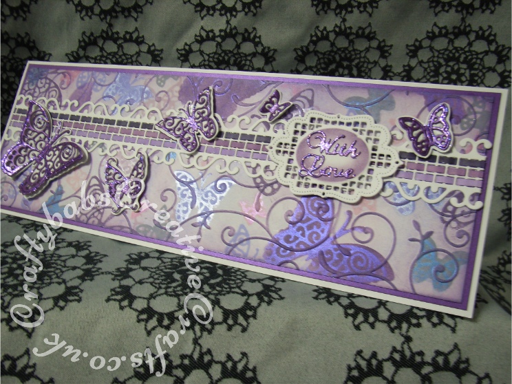 Tattered Lace Country Garden Eltham oval (centre parts), Eltham border and Butterfly dies.Background made using acetate stencils and funky foam stamps cut with the butterfly dies. Embossed with Xcut A4 folder and inked with distress inks. Paper weaving with quilling papers.