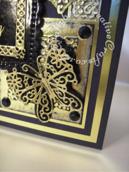 Tattered Lace Golden Wedding. One of my samples for the Elegance 2 collection. Try using die cuts to emboss with, that’s how I made the background and bow on this card. Using the Chatsworth set of dies. The border and centre square die, I used the die cuts and embossed them into gold mirror card, then sanded back and inked with black distress ink.