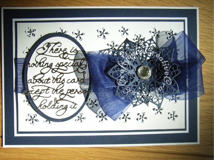 Special Person Card made using Tattered Lace Kaleidoscope XL flowers dies, centre sections only cut from navy card for main flower, and XS die multicut into background and petals lifted for broiderie anglais effect. Sentiment Tattered Lace special person die.