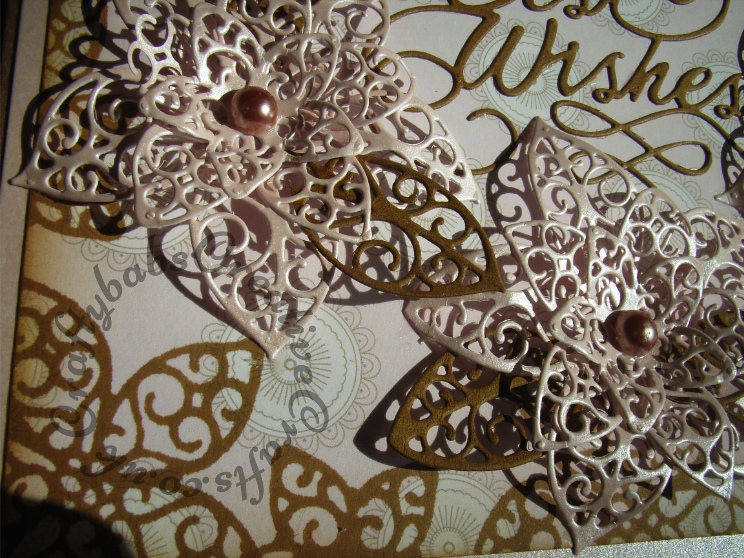 Best Wishes Card made using Tattered Lace Kaleidoscope XL, L & M flowers dies, centre sections only cut from pink pearlescent card for main flowers and Kraft card for leaves. Backgound stamped with funky foam stamps made from the Tattered Lace Kaleidoscope collection flowers dies and distress inks. Sentiment Tattered Lace Best Wishes cut from Kraft card.