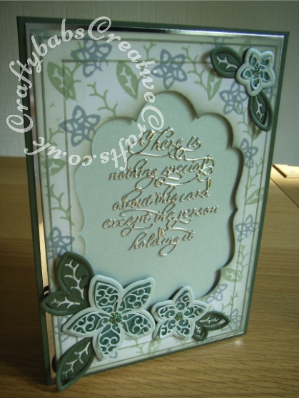 Special Person Aperture Card Tattered Lace Kaleidoscope Flowers L, M & S dies and Kaleidoscope leaves dies. Background stamped with funky foam stamps made using the same dies & distress ink. Aperture cut using Tattered Lace Eltham Ovals large die. Sentiment cut with Tattered Lace Special Person sentiment die.