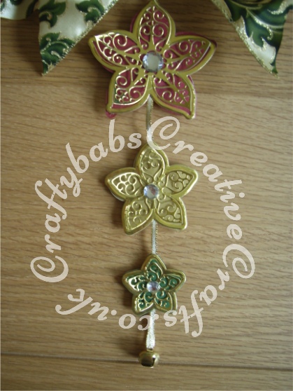 Tattered Lace kaleidoscope Flower Decoration Published March 11, 2016 at 419 × 558 in Tattered Lace Kaleidoscope Collection Samples ← Previous Next → Christmas Bow Decoration made using Tattered Lace Kaleidoscope XL, L & M flowers dies. All flowers cut using both part of each die first in gold mirror board and background layers cut in red, gold and green pearl card.