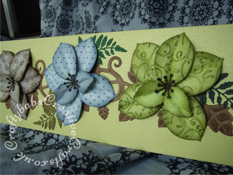 Tattered Lace Flowers from leaves. These dimensional flowers were made using the Lavish Blooms leaves dies cut from patterned papers. These were then embossed with different embossing folders then inked and shaped to form flowers. Lavish Blooms fern leaf used to accent, background vine from Spellbinders (12″ die).