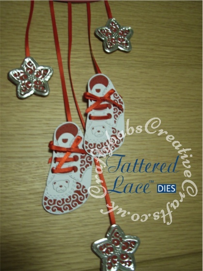 Hanging Baby’s First Christmas Plaque made using Spellbinders Grand Plain ovals for plaque, decoration made using Tattered Lace Eltham ovals die and Tattered Lace Santa die, greeting stamped. Tattered Lace ‘Let It Snow’ sentiment die on reverse of plaque. Hanging decorations made with Tattered Lace Baby Boy Booties die cut x 4 with plain red backers stuck back to back over ribbon. Tattered Lace Kaleidoscope L Flower die cut x 6 with plain red backers glued back to back over ribbon.