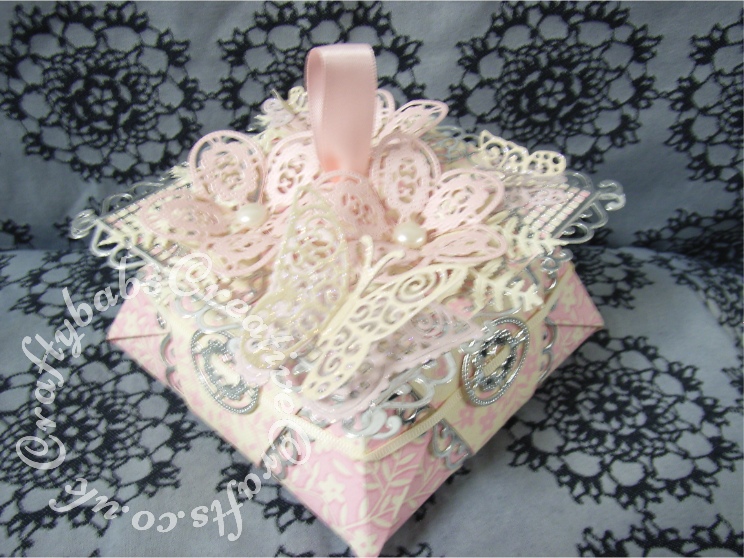 Design team sample Origami trinket box decorated with Tattered Lace Eltham set, corners used for the lid, the smallest oval used to make the flowers and for the ‘buckles’ on the sides. Border die used to trim both the lid and the box base. Additional embellishments made using the Tattered Lace Butterfly and fiddlehead fern dies.