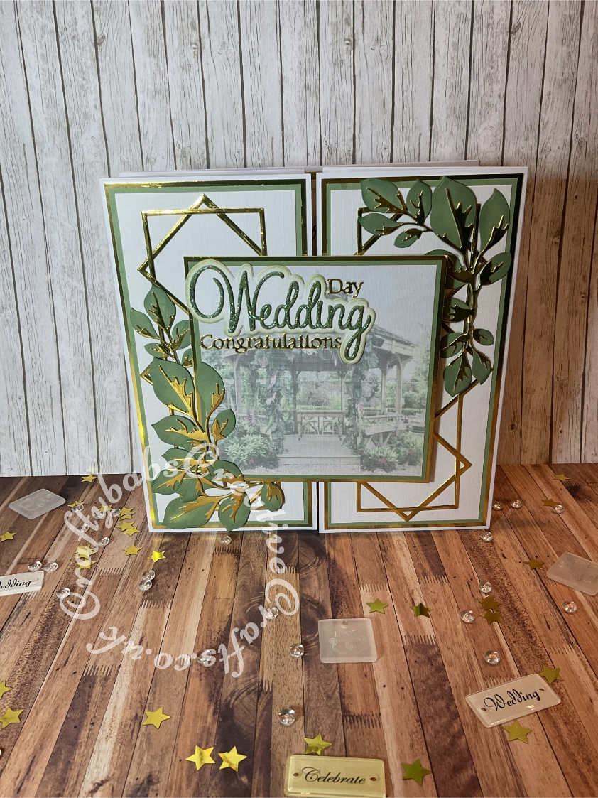 Extra Large Double Shutter Wedding card made using photos of the wedding venue and bride and groom and various dies including leaf dies from the Altenew Jumbo Garden Picks Die set and Altenew Garden picks die set, Nesting square and rectangle die sets to make thin frames, Nellie's multi frames straight hearts hearts nesting dies, unbranded stitched nesting hearts dies, Cheery Lynn Delicate Lace script alphabet dies, Spellbinders watch, lock & key die, Memory Box Floral Breeze die and Tim Holtz Sizzix thinlits friendship words script dies.