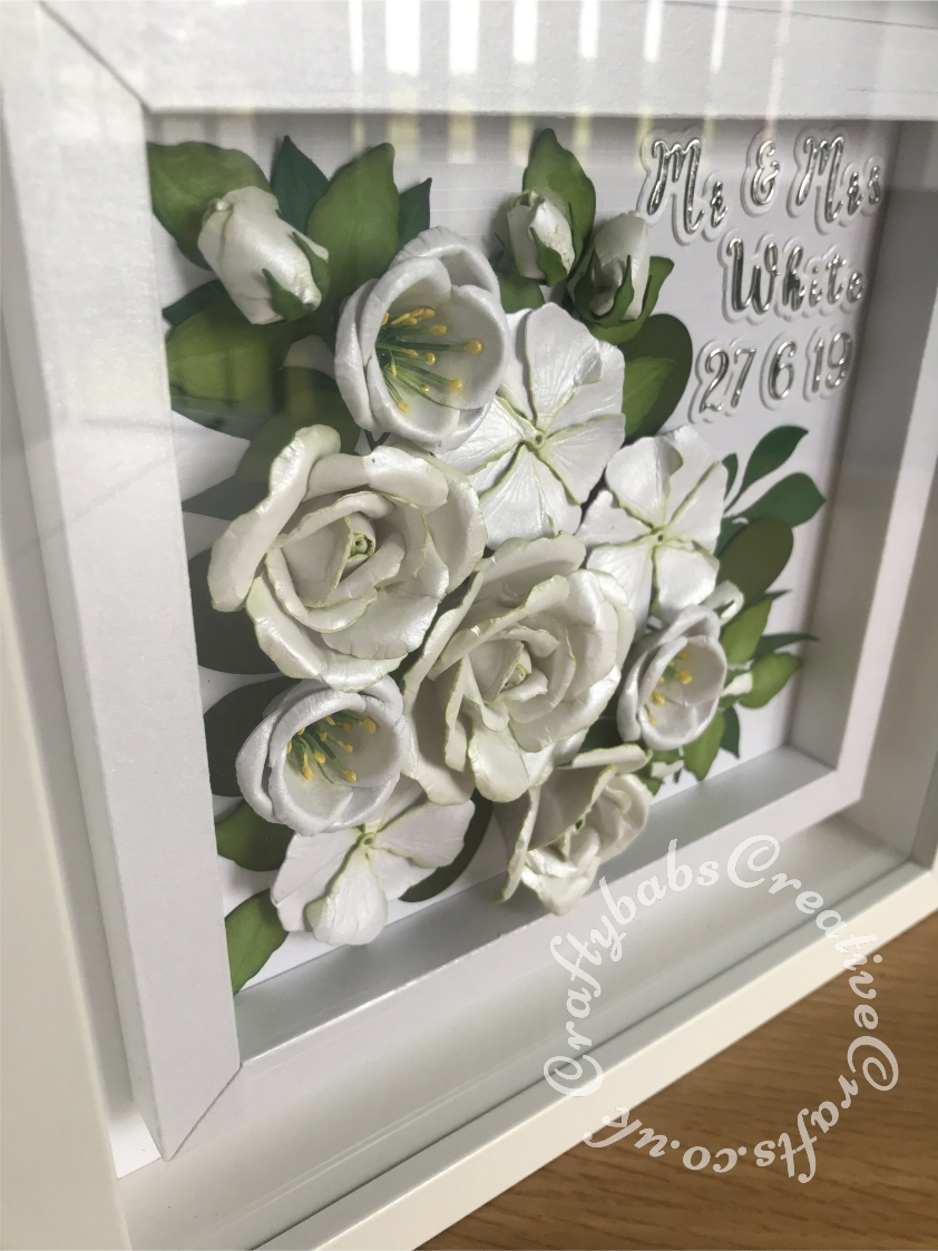 Bridal Bouquet Wedding Keepsake Picture replicating the flowers included in the brides actual bouquet. Flowers created using various dies including Cheery Lynn Designs - Build A Flower #2 - Petals & Leaves, Cheery Lynn Designs Die Build a Flower Embellishment 2 set, Spellbinders Shapeabilities Foliage Die Set, Spellbinders Rose Creations die set, Spellbinders Die D-Lites - Create a Stargazer Lily, Pokey Stems Memory Box Die, Sue Wilson Dies - Finishing Touches - Spring Foliage, Fuzzy Lemon die balloon bunch, Quickutz/lifestyle Crafts Nesting Balloons Cookie Cutter Dies, Tattered Lace Essential Teardrops (ETL183), Altenew Garden Picks 3D Die Set and Spellbinders D-Lites Blooms Three Die. Lettering created using Gemini Die Set Expressions Uppercase Alphabet, Gemini Die Set Expressions Lowercase Alphabet and Gemini Expressions Metal Die - Numbers set. - craftybabscreativecrafts.co.uk