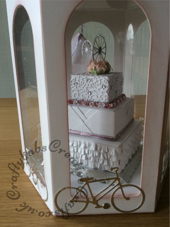 Wedding Day keepsake made to co-ordinate with the Stunning cake, made by the bride herself (checkout Bliss Cupcakes and Celebration cakes on Facebook) and her beautiful dress and also link with the cycling theme of the day. Keepsake made using Scary Mary Celebration Cake kit and various die cutters including Tattered Lace Chatsworth and Haddon die (for lace effect on top cake), Memory box tandem die (bike wheel on top of cake), Quickutz cycle die (on presentation box), small flower punch for tiny roses. Quickutz Scalloped and plain nesting circles (to make ruffles on bottom cake). Card tinted with Tim Holtz Victorian Velvet distress inks (roses and presentation box. Cake stand silver leafed.