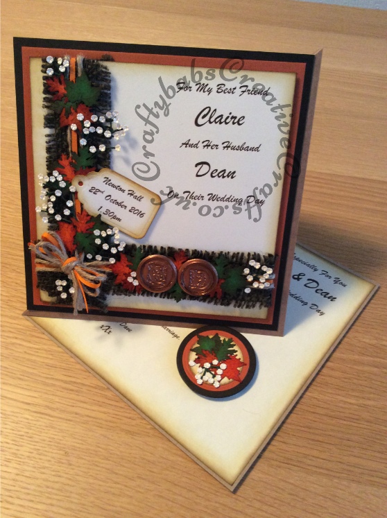Twisted Easel Wedding card made to match the invitation and theme of the wedding. Made using a variety of dies and punches including Woodware leaf punches (oak and maple leaves), Cheery Lynn Baby's breath dies, Nesting circle dies, Sizzix originals scalloped tags die. Wax seals made using grey board circles die cut them triple embossed with UTEE and then stamped while still hot - craftybabscreativecrafts.co.uk