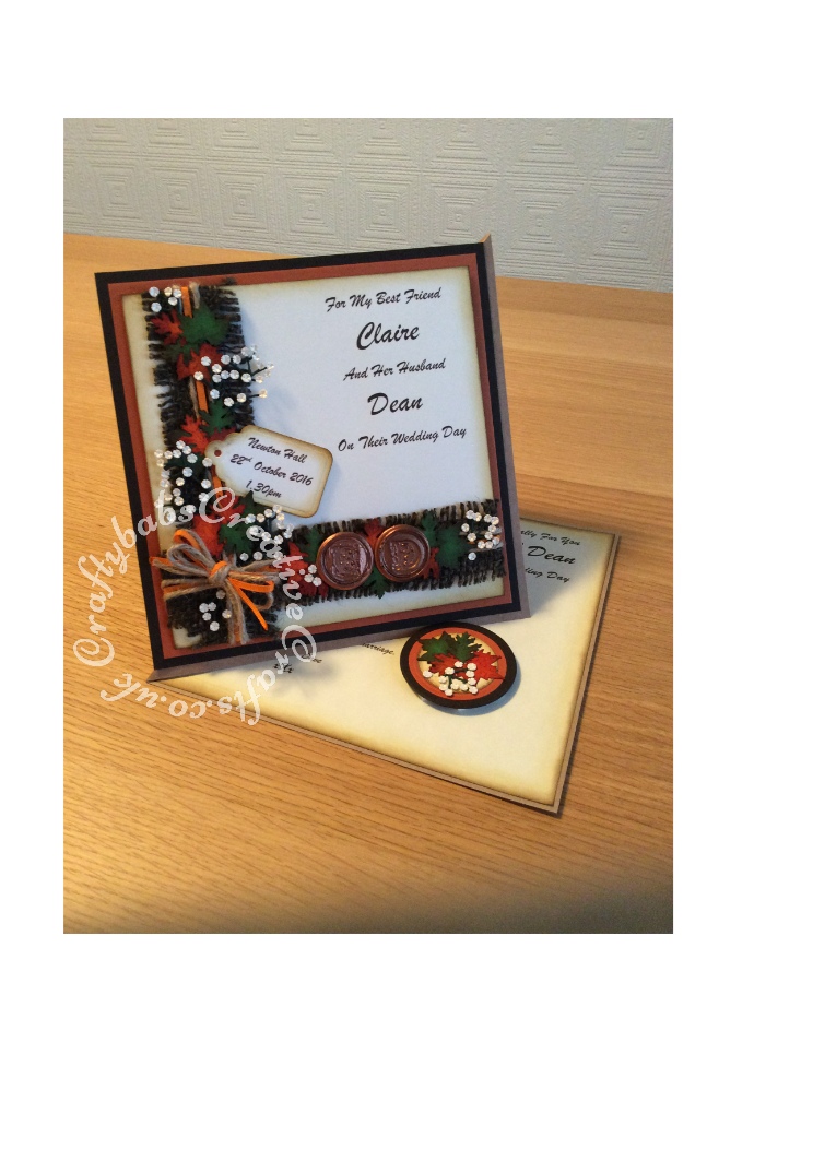 Twisted Easel Wedding card made to match the invitation and theme of the wedding. Made using a variety of dies and punches including Woodware leaf punches (oak and maple leaves), Cheery Lynn Baby's breath dies, Nesting circle dies, Sizzix originals scalloped tags die. Wax seals made using grey board circles die cut them triple embossed with UTEE and then stamped while still hot - craftybabscreativecrafts.co.uk