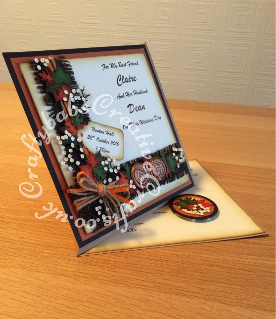 Twisted Easel Wedding card made to match the invitation and theme of the wedding. Made using a variety of dies and punches including Woodware leaf punches (oak and maple leaves), Cheery Lynn Baby's breath dies, Nesting circle dies, Sizzix originals scalloped tags die. Wax seals made using grey board circles die cut them triple embossed with UTEE and then stamped while still hot - craftybabscreativecrafts.co.uk