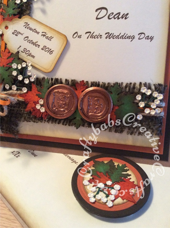 Twisted Easel Wedding card made to match the invitation and theme of the wedding. Made using a variety of dies and punches including Woodware leaf punches (oak and maple leaves), Cheery Lynn Baby's breath dies, Nesting circle dies, Sizzix originals scalloped tags die. Wax seals made using grey board circles die cut them triple embossed with UTEE and then stamped while still hot - craftybabscreativecrafts.co.uk