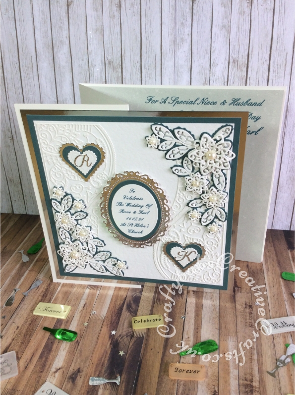 Large 8″ square Wedding card made using a variety of dies including Tattered Lace double delights adore & Kaleidoscope flower corner dies, Spellbinders floral and plain nesting ovals & scalloped and plain nesting hearts. Sentiment printed, monograms die cut using Britannia Dies alphabet dies and layered onto hearts using spellbinders nesting plain and scalloped hearts dies.