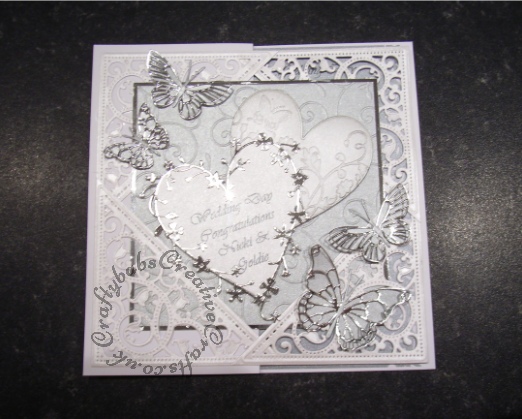 8″ square Wedding card made using included Spellbinders Gold Elements dies, Memory Box Kaleidoscope, moonlight, Pippi, Isabella, Vivienne and Darla butterflies, Bingham and Grand Heart dies. Background embossed with Xcut embossing folder.