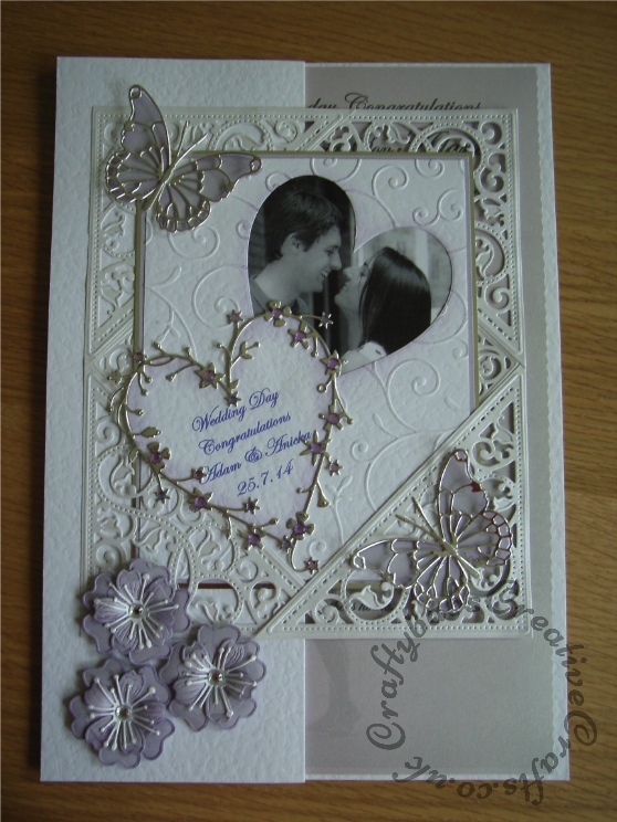 Large A4 Wedding card made using included Spellbinders Gold Elements dies and blooms 3 dies, Memory Box Vivienne and Darla butterflies, Bingham and Grand Heart dies. Background embossed with Xcut embossing folder.