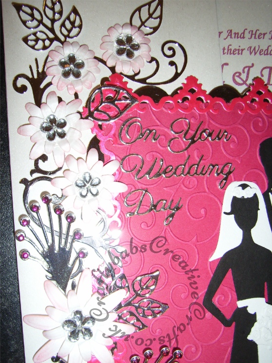 Large A4 Wedding card, coloured to match wedding theme made using spellbinders antiques accents border die, Quickutz lifestyle crafts cookie cutter bride & groom dies, Xcut flowers dies and Marianne leaf and flourish dies. Background embossed with Xcut A4 folder. Sentiment cut using Britannia sentiment dies.