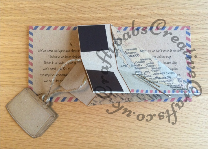 Save the date paper plane cards made using Craft Artist Professional 2 software, 300gsm Kraft card, r.s.v.p suitcase tag made using Cuttlebug Disney travel themed cutting die and matching embossing folder, printed with details and tinted with walnut stain distress ink. Personally written poem including details written on separate card with airmail edging using CAP2. Self adhesive magnets attached to reverse of plane to enable use as fridge magnet.