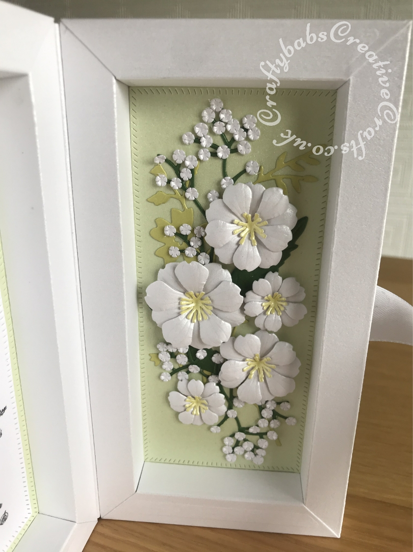 3D Shadow Box Wedding card made to co-ordinate with Invitation using various dies including Spellbinders nesting plain and scalloped hearts dies, Cheery Lynn Designs Die - Build a Flower Embellishment #2, Memory Box Fabulous Phlox dies, Memory Box die - Honeyblossom Sprig, Memory Box Norrland Flower dies, Tonic Studios Shadowbox Creation Die Set, Tonic Studios Large Romantic Vine Ovals die set and XCut Mini Handmade With Love Cutting Die, - craftybabscreativecrafts.co.uk