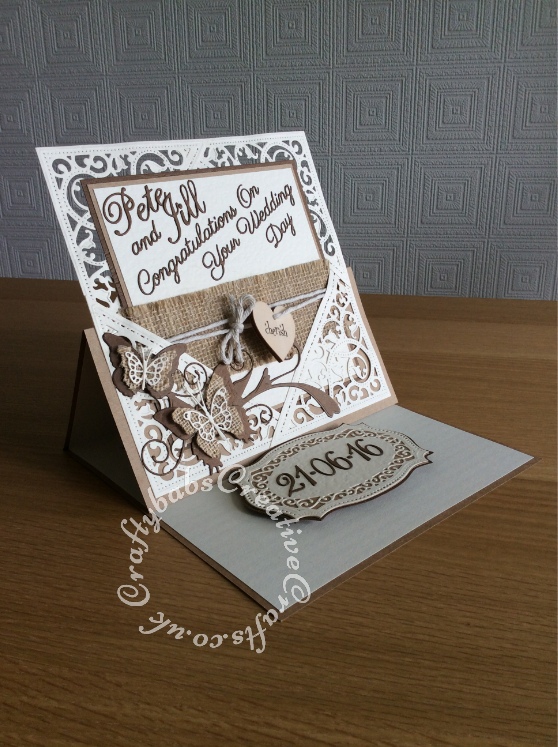 Wedding card and matching photo frame gift made to match wedding invitation using a variety of dies including; Spellbinders gold elements one dies, Labels 25 and majestic labels 25, and Nesting plain and scalloped hearts dies, Memory Box Gwyneth flourish and Levenworth and Cascadia butterfly trio dies, Cheery Lynn delicate lace script dies, Britannia sentiment die,Tattered Lace ‘A Date To Remember’ dies, Quickutz Nesting plain and scalloped circle dies. and spellbinders les papillions die. Hessian butterflies were shop bought. Hessian ribbon, string & wooden heart were on wedding invitation, rub on transfers applied to both sides of wooden heart.