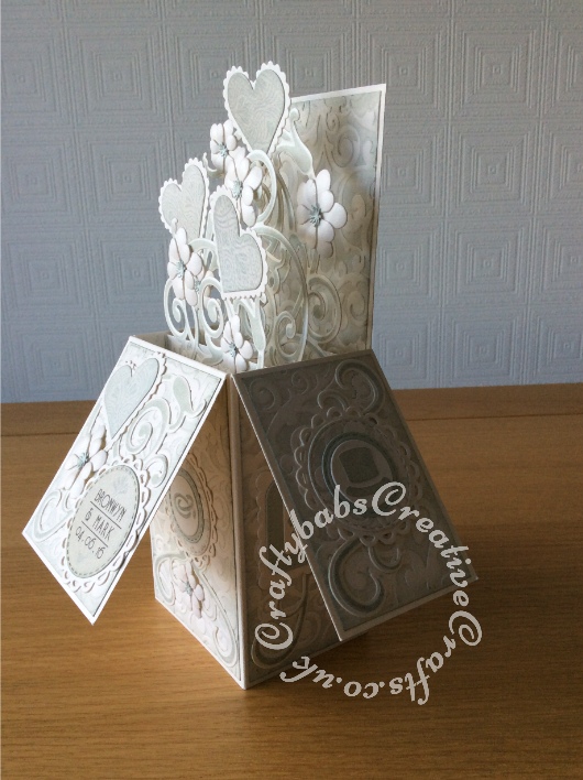 Pop up Wedding card made using a number of dies including; Spellbinders nesting plain and scalloped hearts dies, Cheery lynn flowers dies, Anna griffin flourish scroll die, spellbinders lacey circles dies, Crea Nest lies no 33 dies, leabilities frame square curve die set (for small flourishes). Joy cut & emboss wedding die set, Nellies nesting stitched squares dies, Background embossed with distress ink applied to folder using embossaliscious a4 folder.
