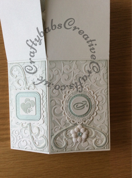 Pop up Wedding card made using a number of dies including; Spellbinders nesting plain and scalloped hearts dies, Cheery lynn flowers dies, Anna griffin flourish scroll die, spellbinders lacey circles dies, Crea Nest lies no 33 dies, leabilities frame square curve die set (for small flourishes). Joy cut & emboss wedding die set, Nellies nesting stitched squares dies, Background embossed with distress ink applied to folder using embossaliscious a4 folder.
