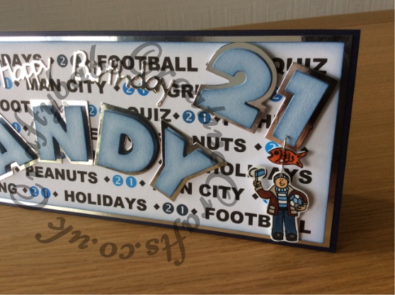 Men’s birthday card Published August 10, 2015 at 558 × 417 in Men’s birthday card ← Previous Next → 21st Birthday card made with background printed with words appropriate to the recipient. Letters and numbers cut using Sizzix Originals Shadow Box alphabet.