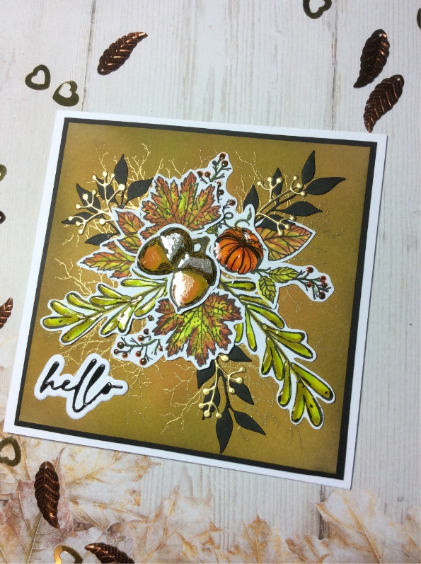 Hello card made using the free Autumn Days stamp set from issue 208 of Simply Cards & Papercraft magazine, Versafine Onyx Black ink, gold embossing powder, spectrum aqua pens, Hunkydory Prism watercolour brush markers, Tim Holtz distress inks, Ranger Glossy accents, altenew leaf die and unbranded sentiment and berries dies.