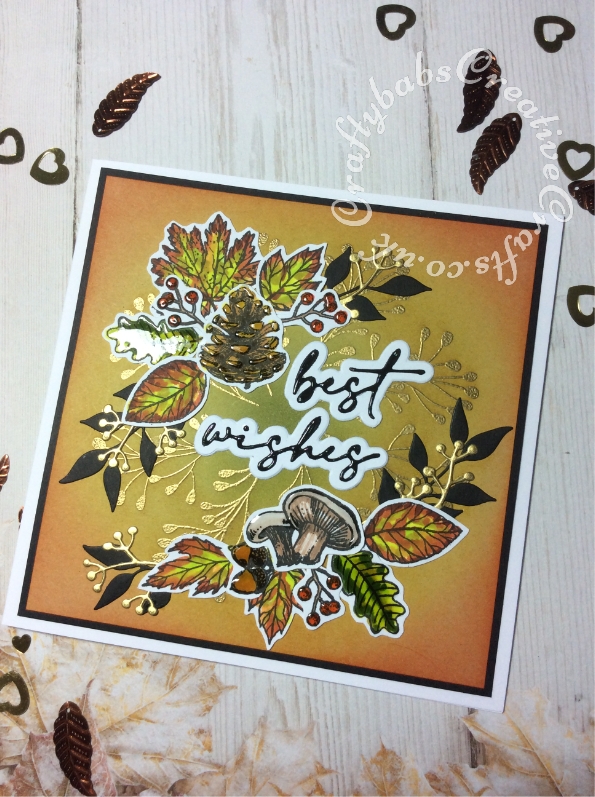 Best Wishes card made using the free Autumn Days stamp set from issue 208 of Simply Cards & Papercraft magazine, Versafine Onyx Black ink, gold embossing powder, spectrum aqua pens, Hunkydory Prism watercolour brush markers, Tim Holtz distress inks, Ranger Glossy accents, altenew leaf die and unbranded sentiment and berries dies.