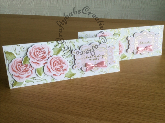 Thank You & Birthday Cards made using the Altenew Rose Stamp and die that was the cover gift on issue 149 of Simply Cards & Papercraft. Background inked using a stencil made with a die from the Sizzix Tim Holtz Mixed media 2 Thinlits backgrounds set. Sentiment plaque stamped and die cut with the Sizzix Labels Flourish Etiquettes framelits stamp and die set. Sentiments stamped using the Paula Pascual Everyday Tab Messages stamp set.