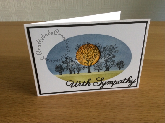 Simple stamped Sympathy card made by inking though oval stencil and stamping tree silhouette. Two image made, one with orange and yellow sky, the other with blue sky. Circle nesting die used to cut out the 'Moon' from the same place in each image. The cut circles were then swapped over to create 2 cards with a different coloured moon. Top layer mounted onto foam squares for dimension. - craftybabscreativecrafts.co.uk