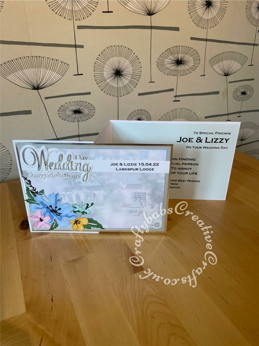 Z Fold Wedding card made using image of the wedding venue and embellished using various dies including ; Tattered lace sentiments 2014, Sizzi Brushstroke Flowers #2, and Joy Crafts dies Wedding phrase. - craftybabscreativecrafts.co.uk